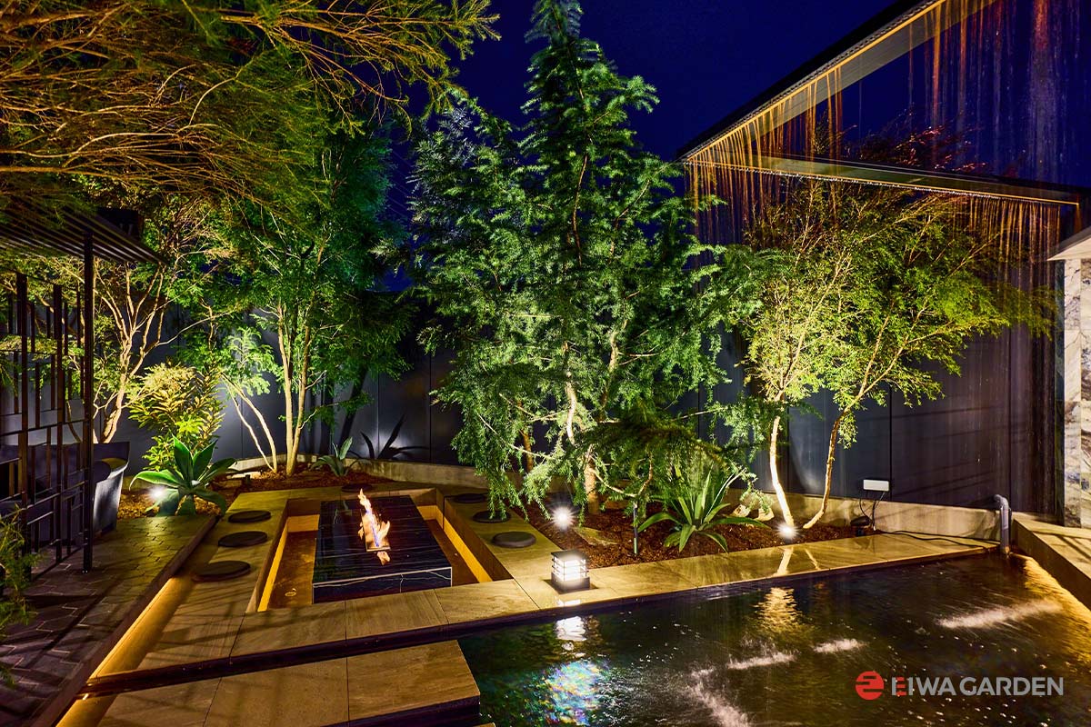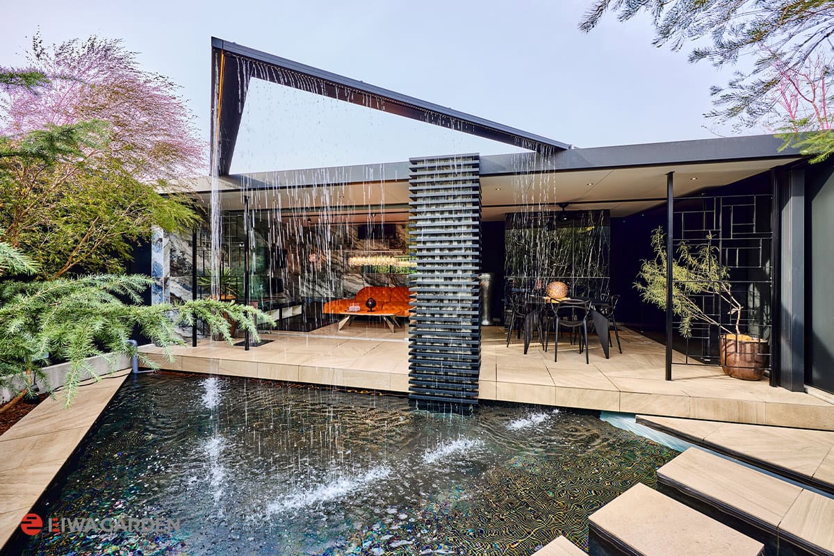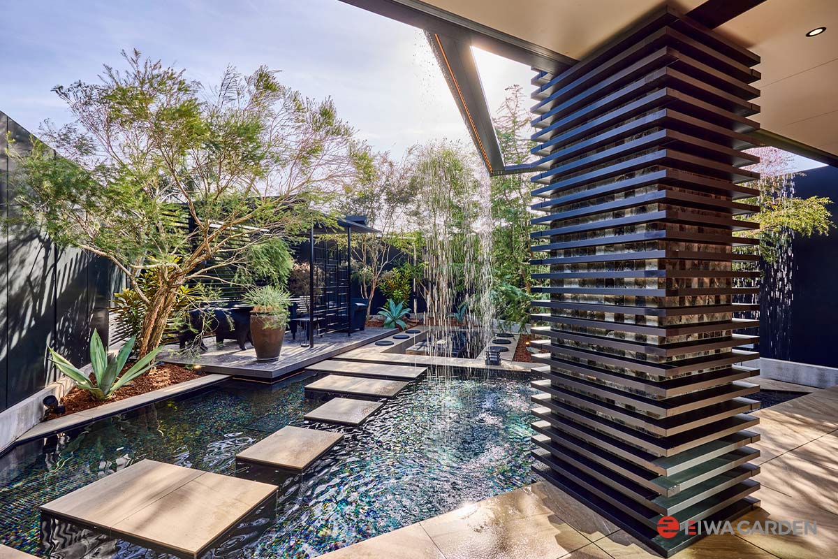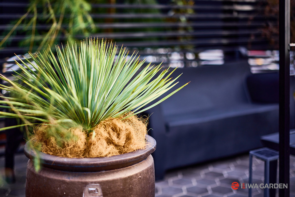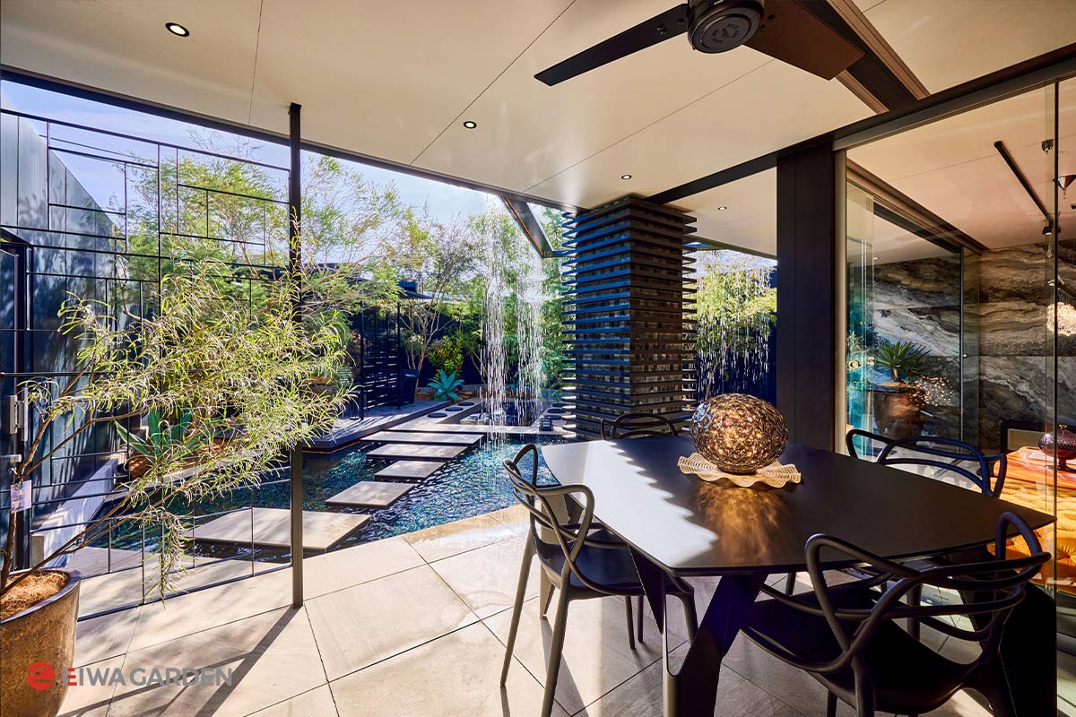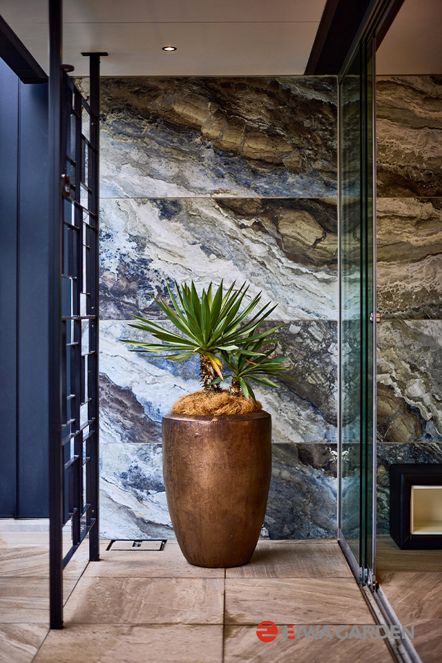 外から近づくと鳴り響く滝の音。ドアを開けると一面に光輝く、水しぶきがお出迎えしてくれます。背景に広がるのはオーストラリアの森。オージープランツを主体にドッシリとした植栽がワイルドに空間を彩ります。