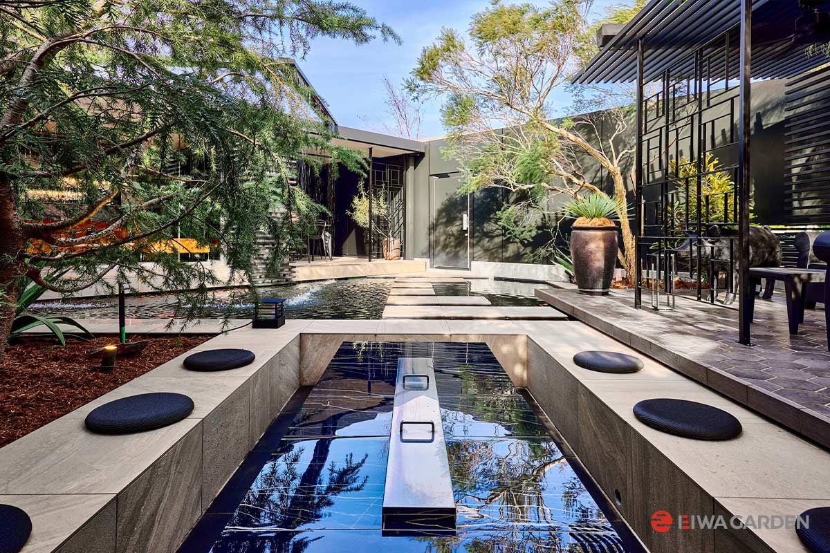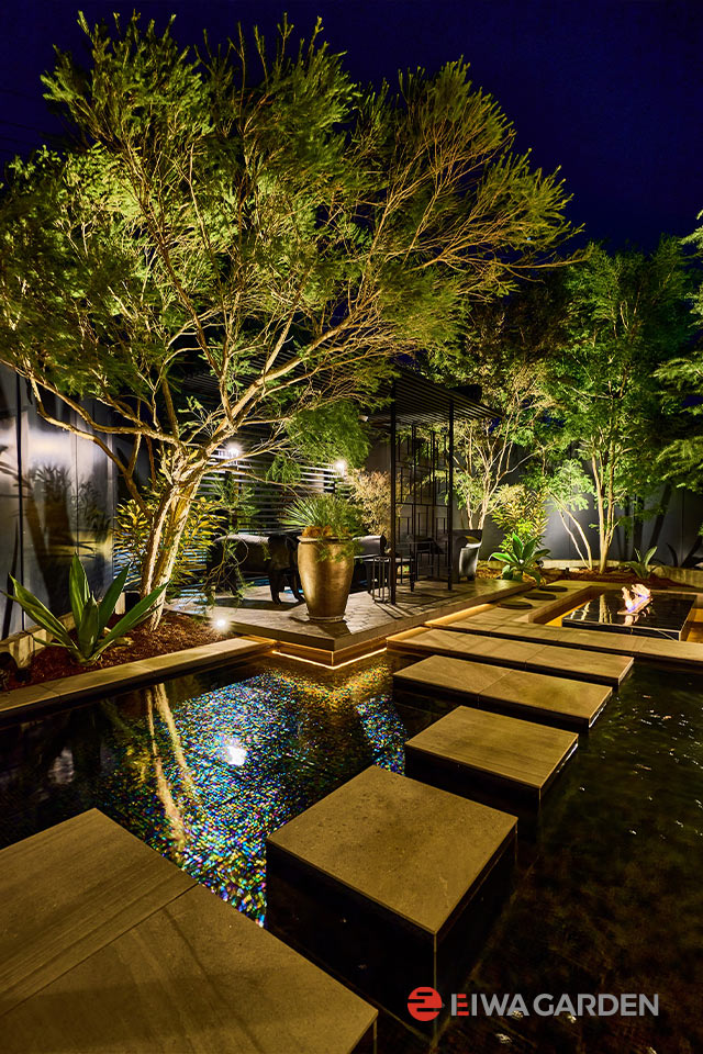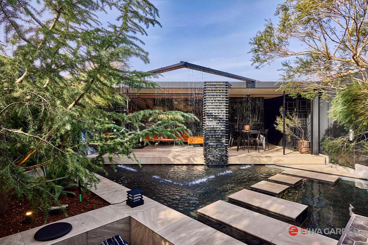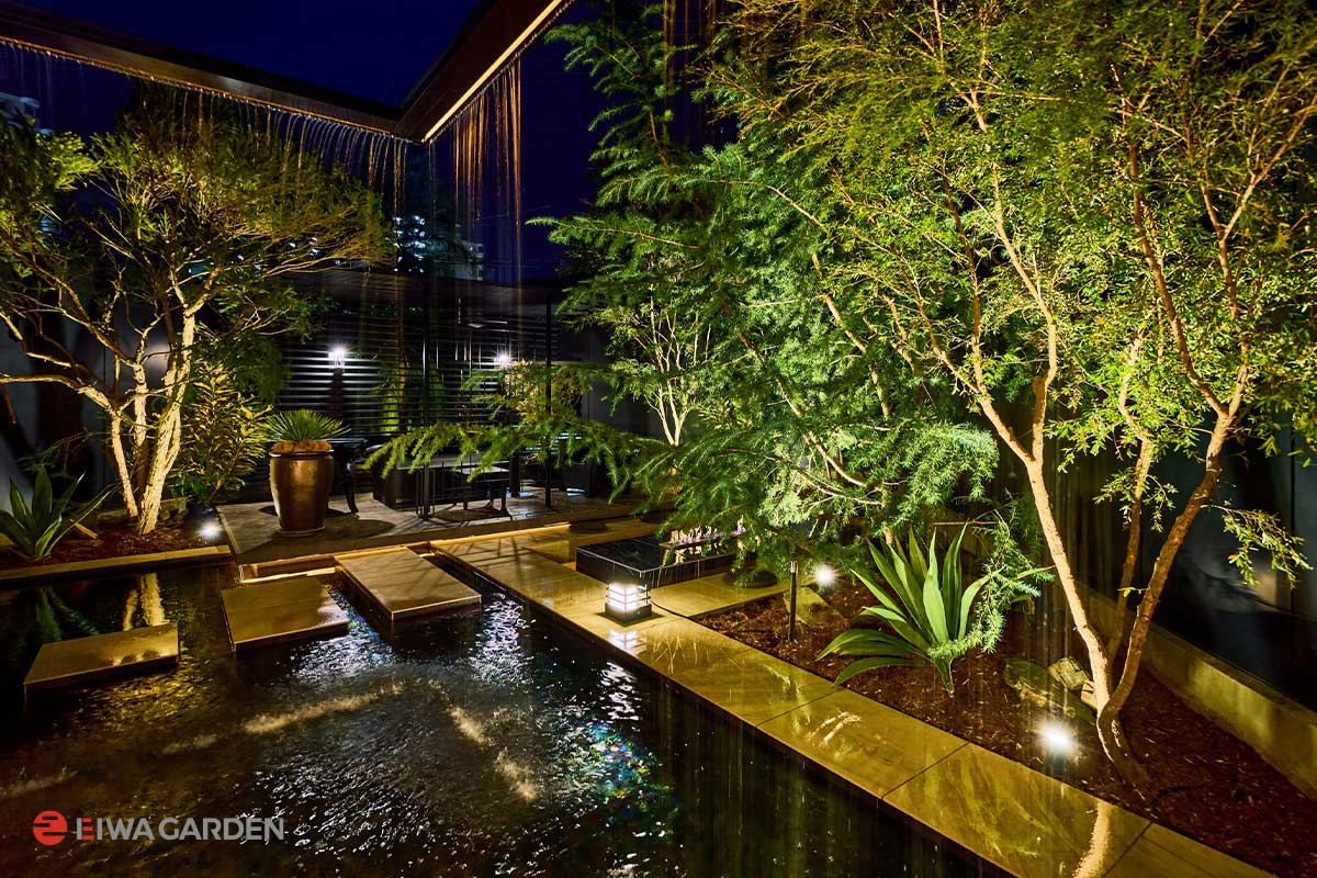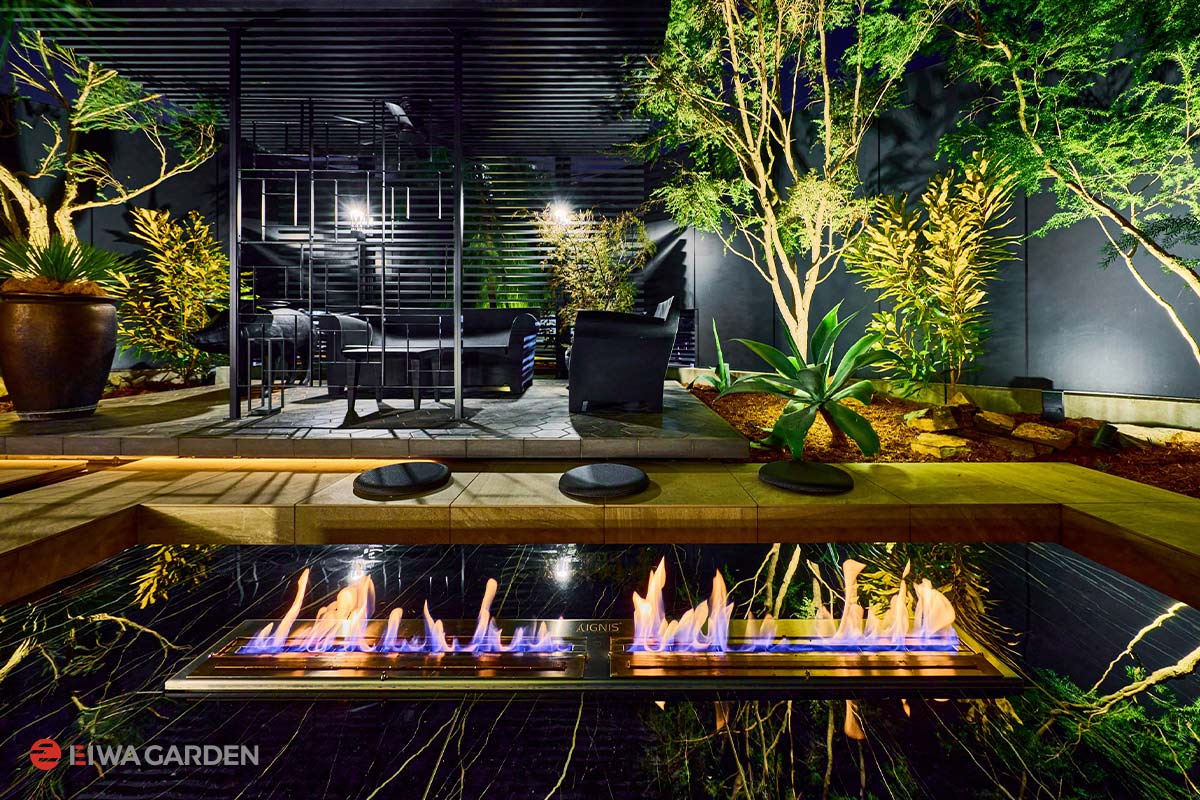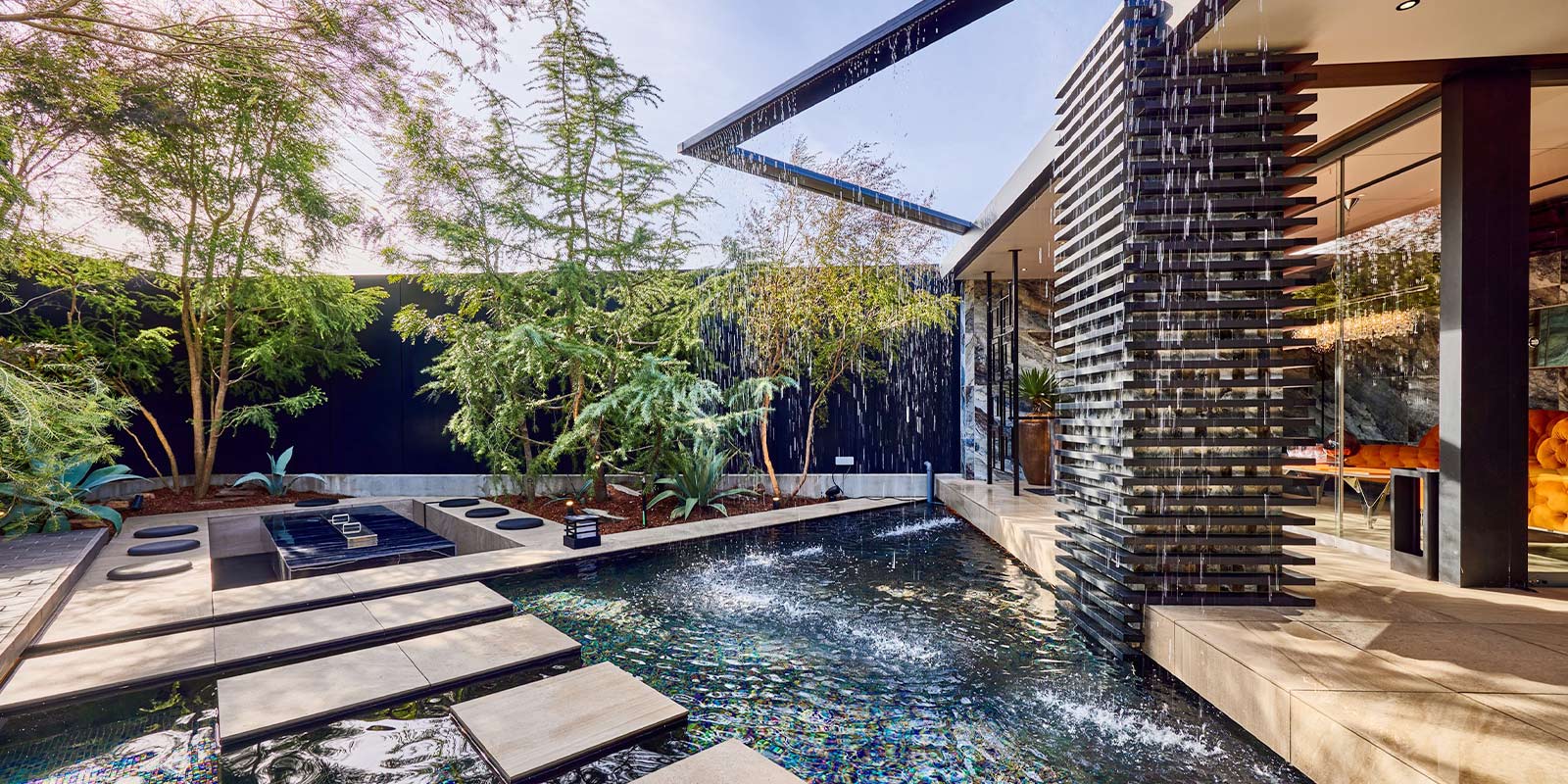 外から近づくと鳴り響く滝の音。ドアを開けると一面に光輝く、水しぶきがお出迎えしてくれます。背景に広がるのはオーストラリアの森。オージープランツを主体にドッシリとした植栽がワイルドに空間を彩ります。