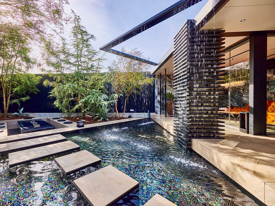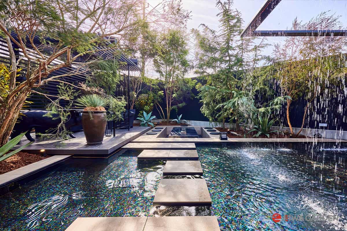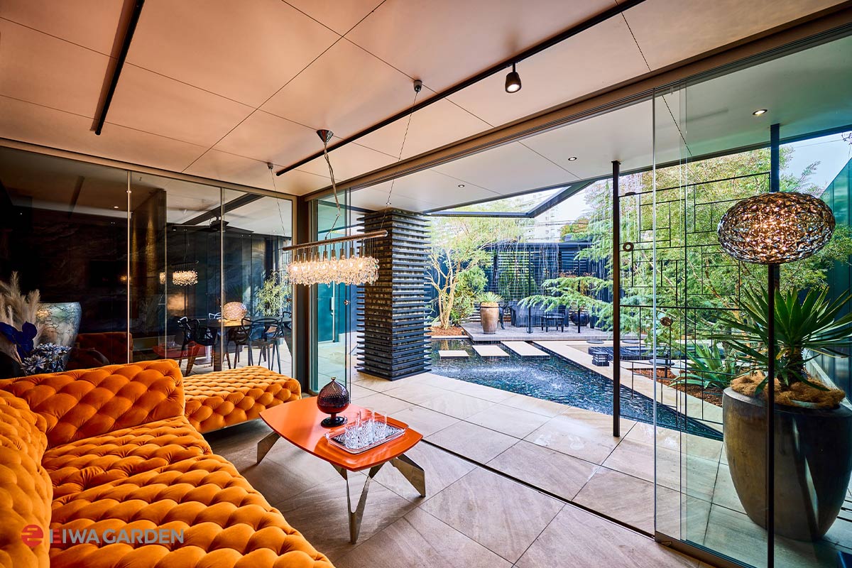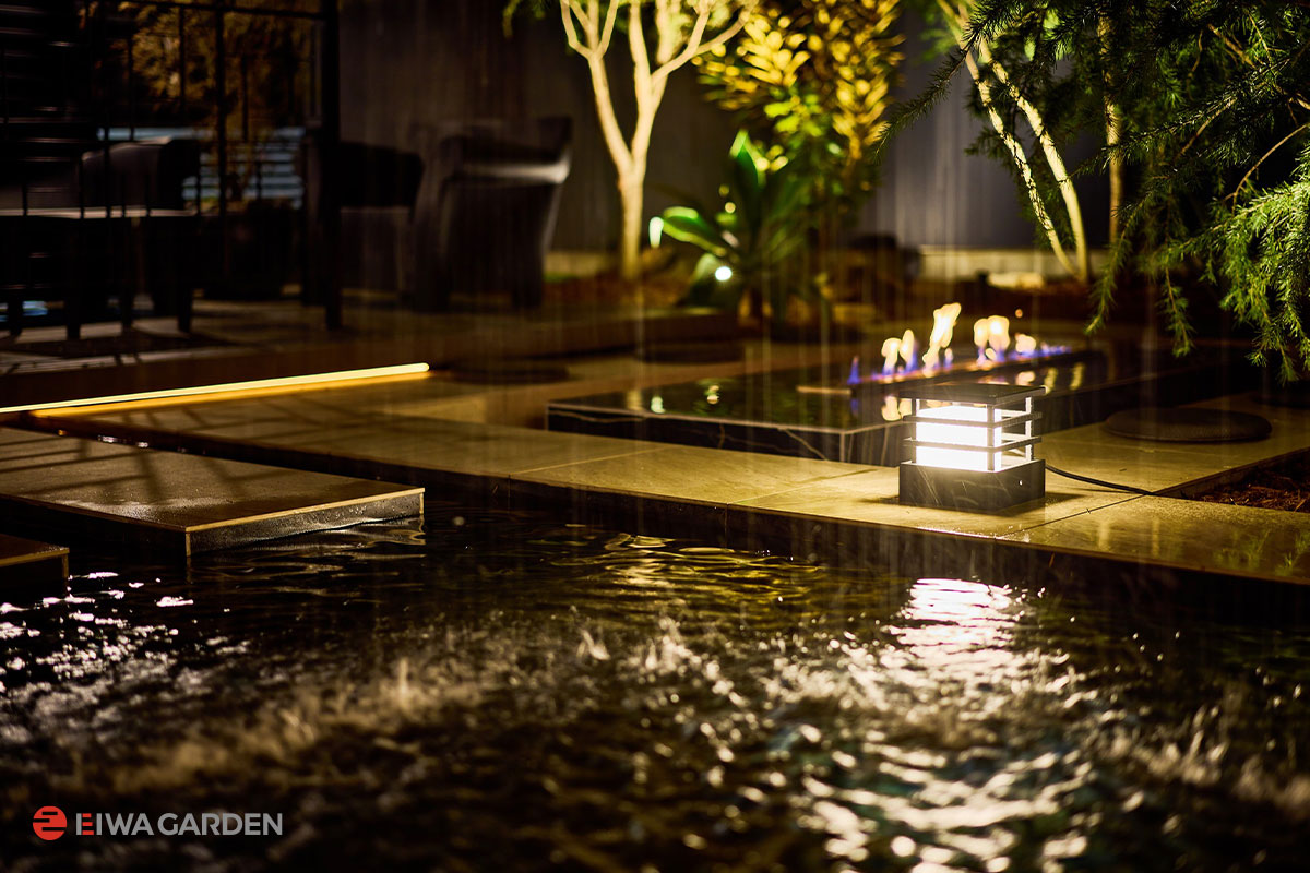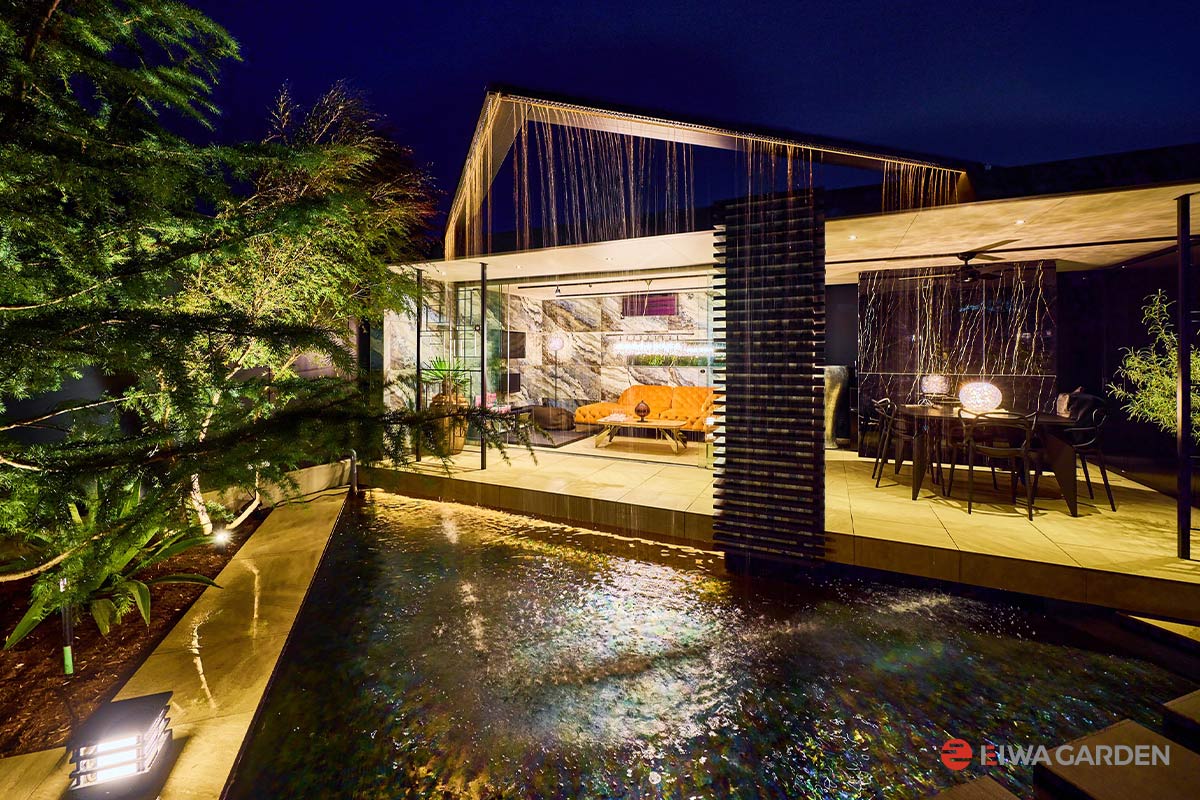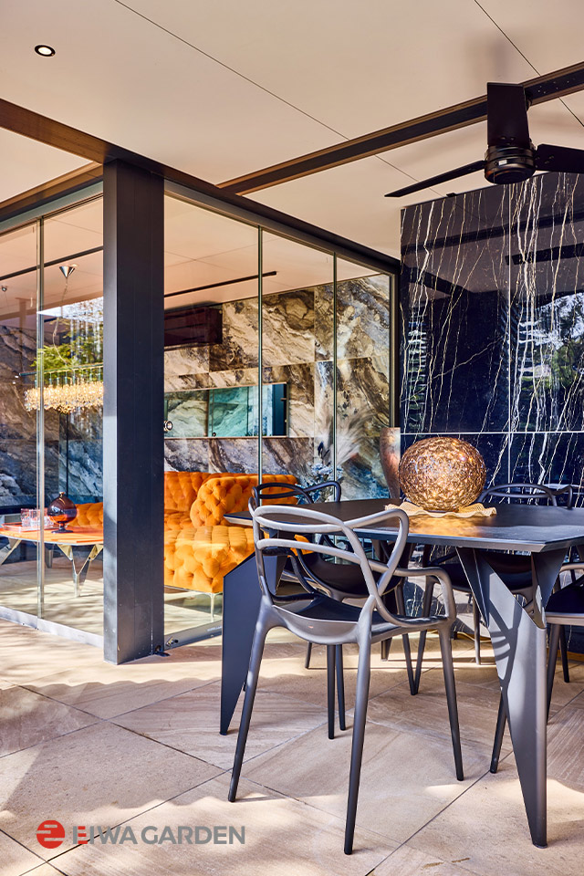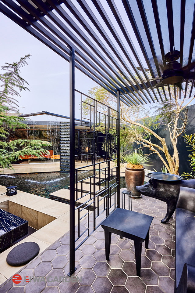外から近づくと鳴り響く滝の音。ドアを開けると一面に光輝く、水しぶきがお出迎えしてくれます。背景に広がるのはオーストラリアの森。オージープランツを主体にドッシリとした植栽がワイルドに空間を彩ります。