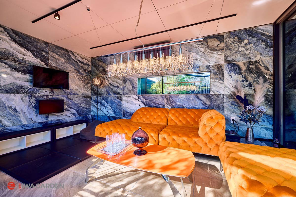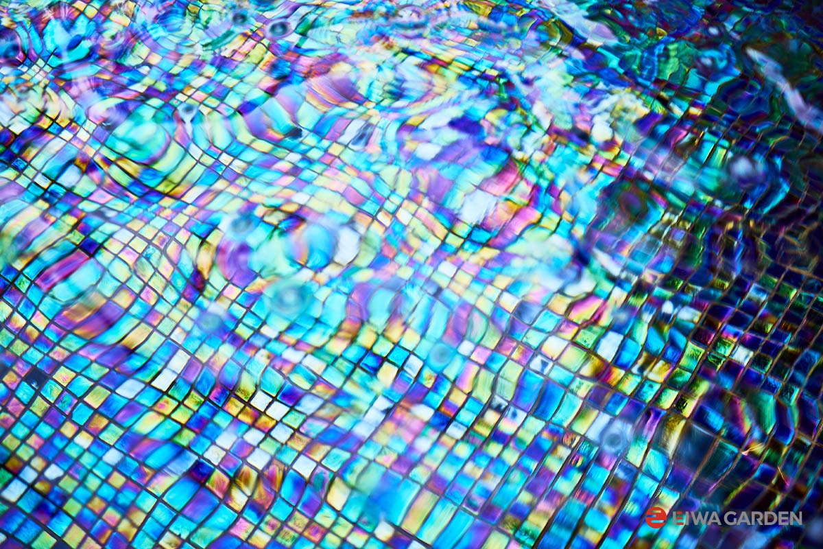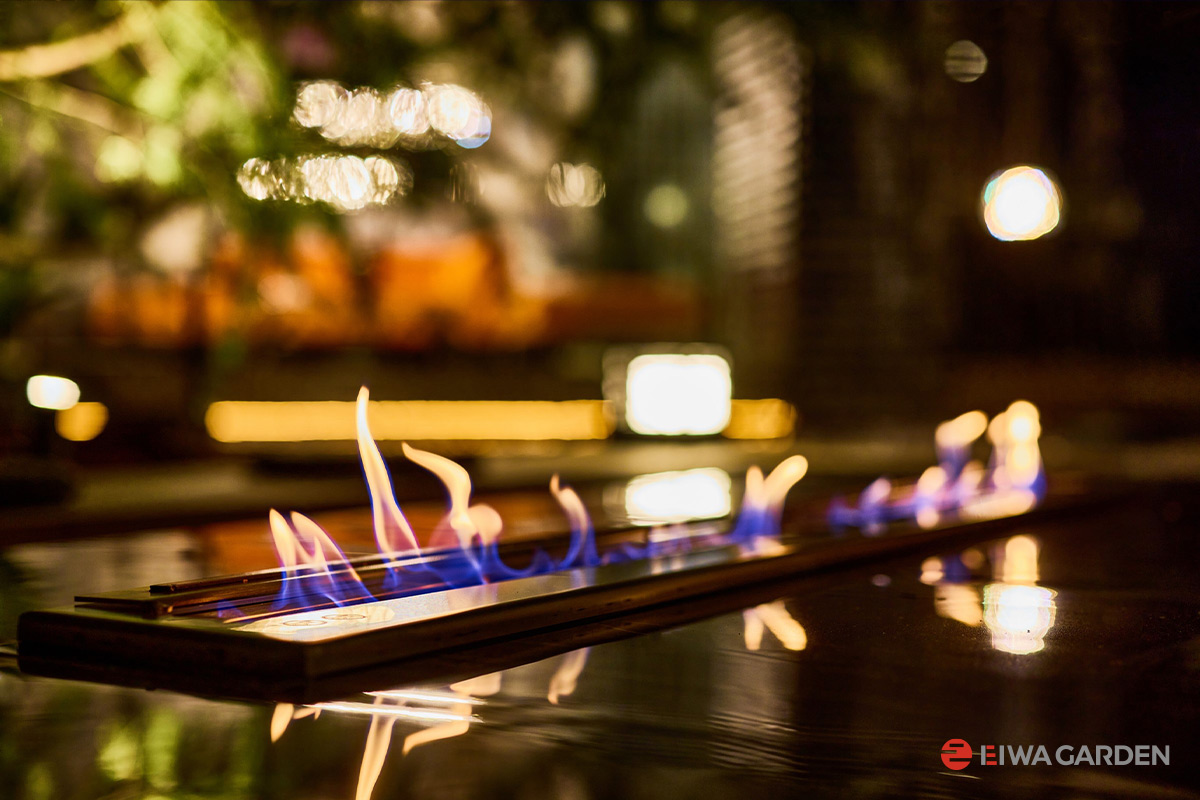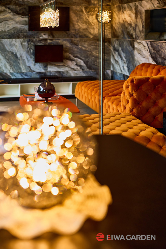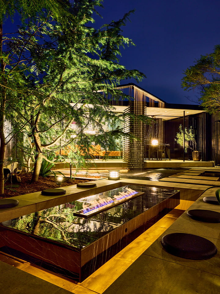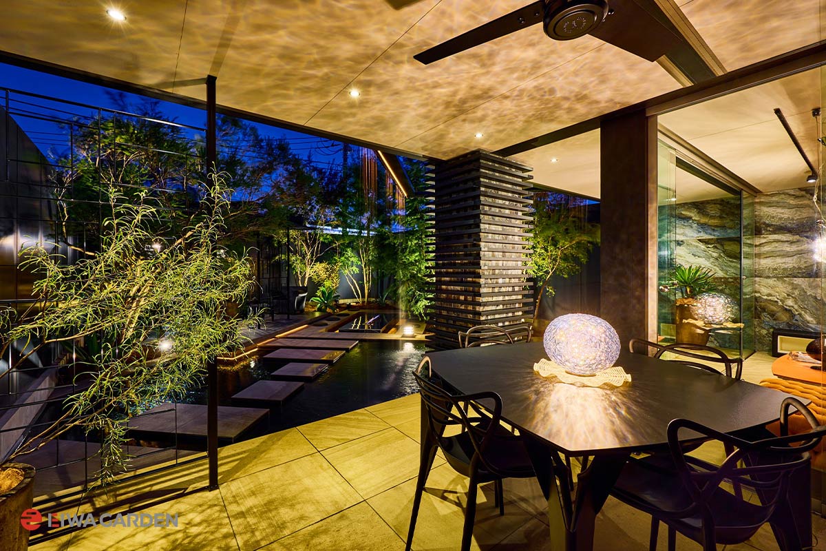 外から近づくと鳴り響く滝の音。ドアを開けると一面に光輝く、水しぶきがお出迎えしてくれます。背景に広がるのはオーストラリアの森。オージープランツを主体にドッシリとした植栽がワイルドに空間を彩ります。