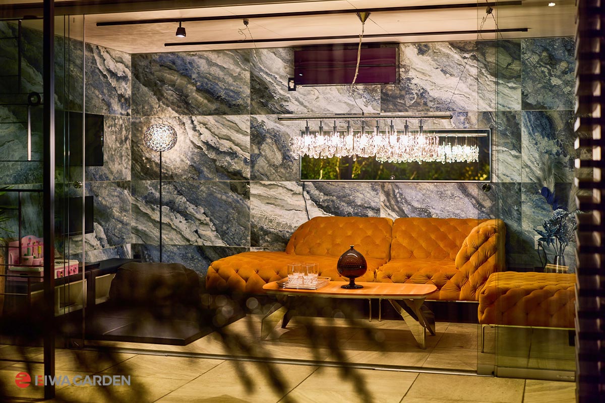 奥に進めば、オールグラスポーチの壁に浮かぶ碧海の部屋。打ち合わせスペースは海をイメージした大判タイルで落ち着いた空間を演出しました。大自然を感じながらアイデアの海を楽しんでいただければ幸いです。