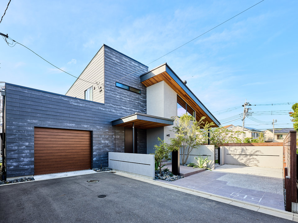 変形地の迫力ある建物を迫力ある外構でまとめる