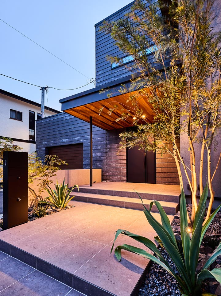 3枚の壁で造るセミクローズ外構。横へと広がる壁が建物に負けずにダイナミックな空間を演出しています。床タイルは名古屋モザイク/バイオフィリック…自然石を表現したナチュラルな雰囲気を醸し出します。車庫床は洗い出しコンクリートでナチュラルにも汚れにも配慮。こだわり樹形のブラックティーツリー×アカシアフロリバンダが空間に華やかさをプラスします。