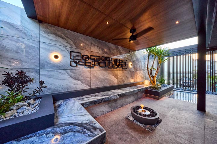 巾木から続く花壇のブラックカラーが空間を引き締め、迫力溢れるカーポートSCと600角の大判タイルが空間をゆったりと演出。ディティールへのこだわりこそ、このエクステリアの神髄と言えます。